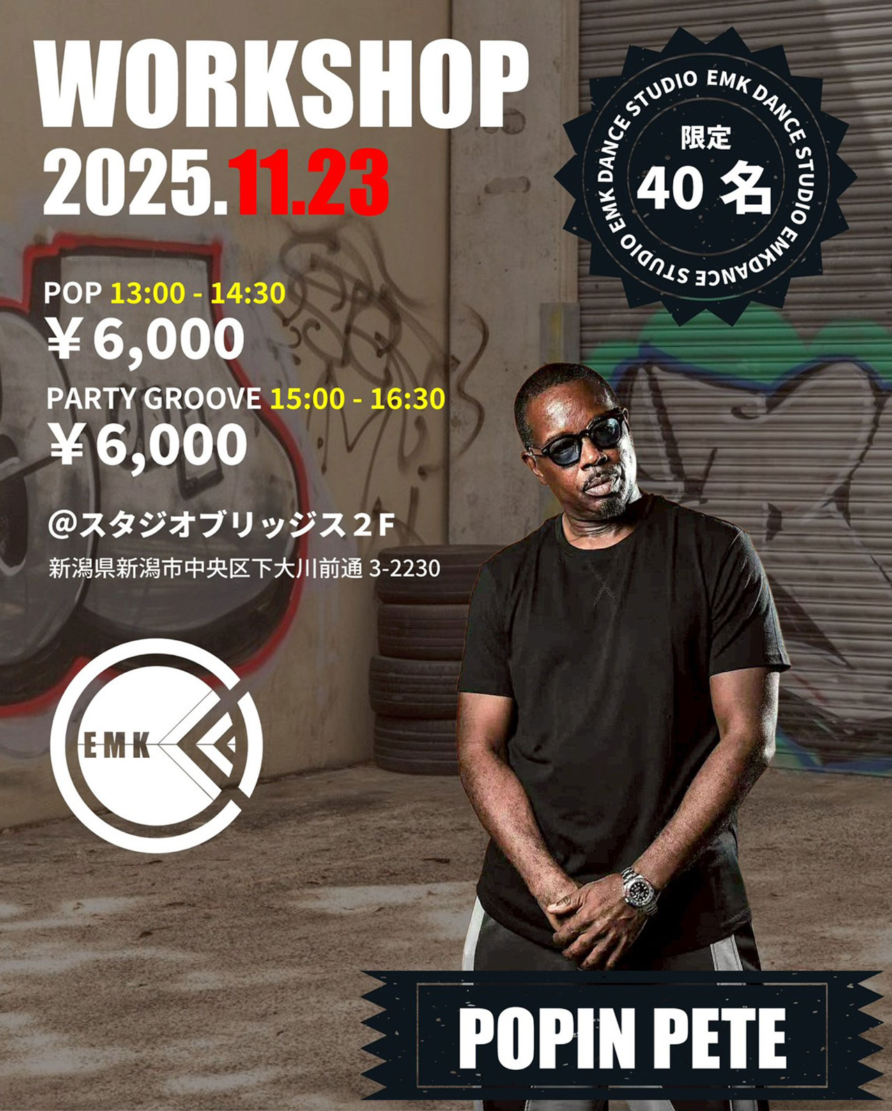 ストリートダンスのオリジネーター「POPIN PETE」は世界で数少ない本物を伝えられる存在です。彼しか分からないオリジナルスタイルをより深くレクチャーしてくれます。皆さんこの貴重なチャンスを是非お見逃しなく!!!